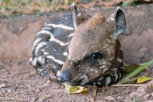 Baby tapirs are born with stripes and spots, like baby boars. This fur is necessary to be camouflaged in order to elude predators. It fades as they get older, after 5-6 months. The cubs stay with the mother for about 12-18 months after their birth.