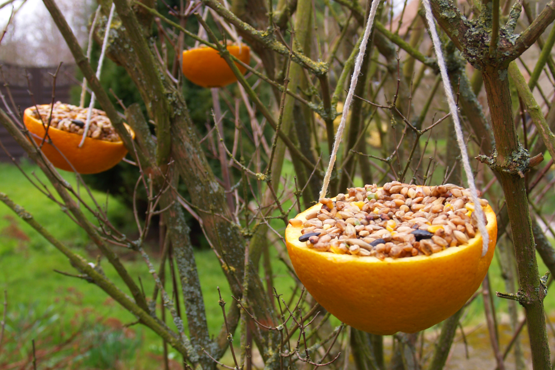 To create this feeder you just need a lemon net, margarine or butter and a few seeds or peanuts. Melt the margarine or butter and knead it with peanuts or crumbled biscuits. Make a few balls and keep them into the fridge so that they solidify. This will be a tasty snack for titmice or goldfinches.