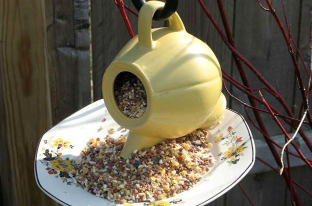 To make this feeder, you just need an old teapot, a plate, an old umbrella handle and glue. We can even put some pieces of meat or fat into it to attract titmice, starlings, robins, blackbirds, thrushes.