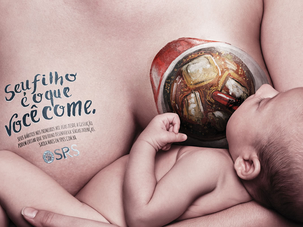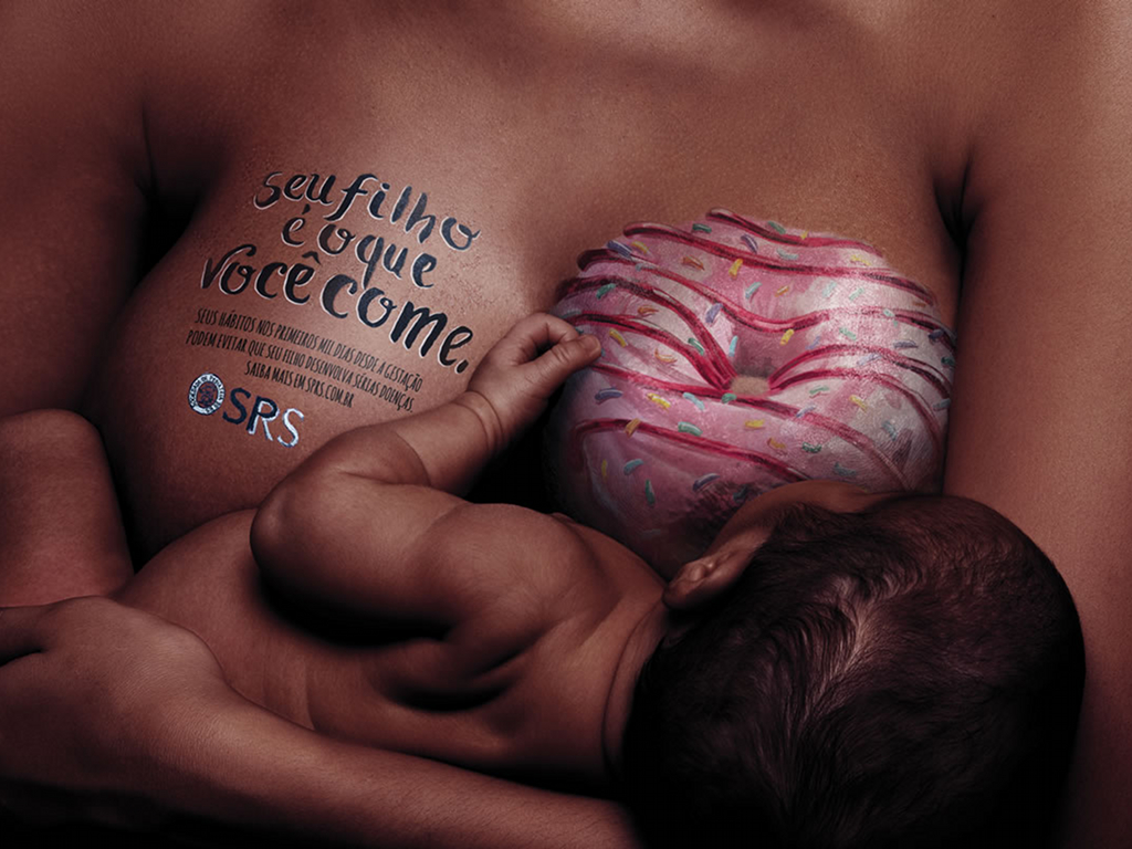 Breast milk is surely the healthiest food for newborns. But is this always true? Which consequences could the bad eating habits of a breastfeeding mother have on her kid’s health? This is the provocation of the new shocking advertising campaign launched by the Pediatric Society of Rio Grande do Sul, Brasil, (and endorsed by the agency Paim). Its claim “Your child is what you eat” remembers the precise responsibilities of a breastfeeding mom towards her kid. The pictures, which went around the world, feature an unweaned child sucking through their mother breast a hypercaloric hamburger, a soda or other types of junk food.