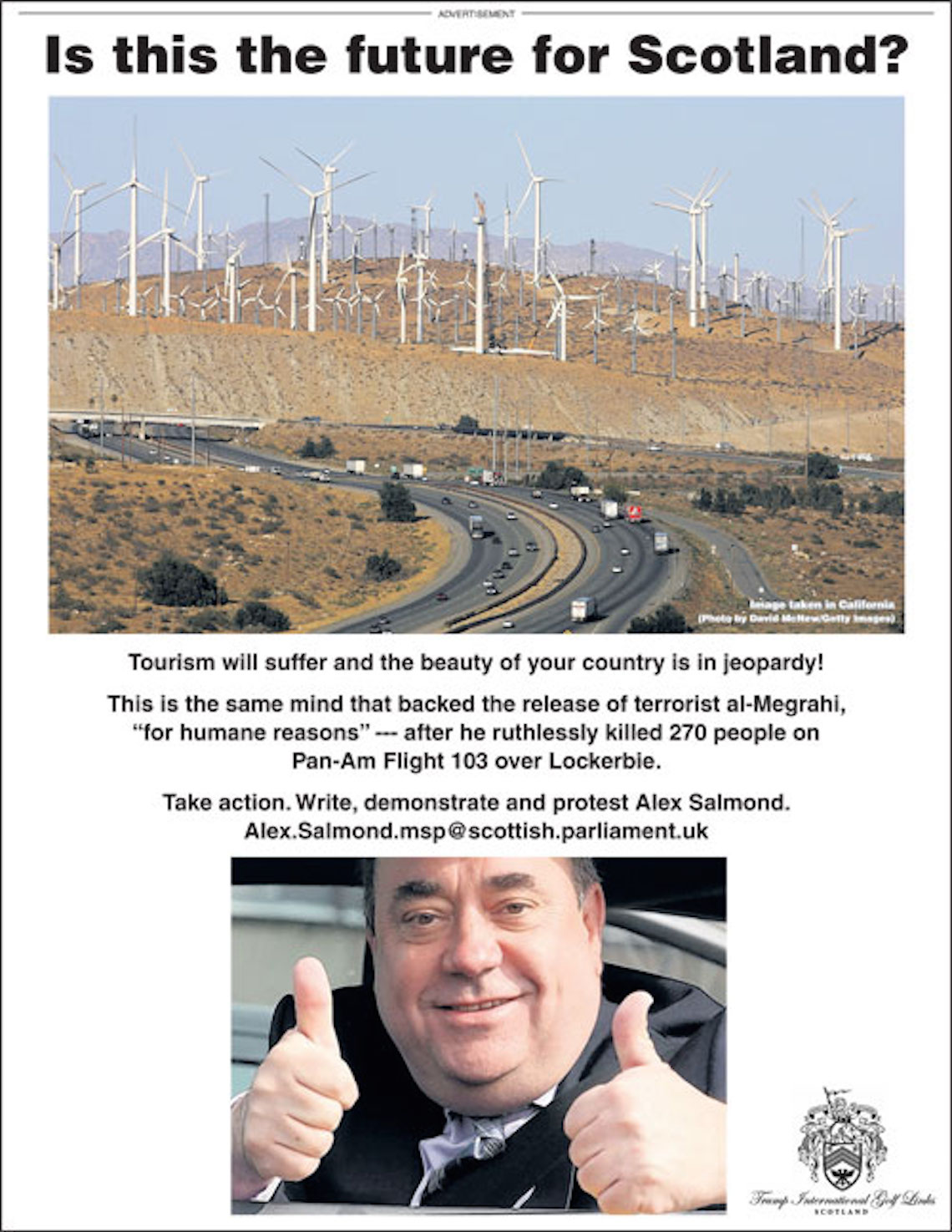 Trump’s war with the ASA and Scottish government took an unexpected turn in 2013 when he commissioned an advert with the caption “welcome to Scotland” over a picture of a large dilapidated wind farm. The advert was eventually banned after it was revealed that the picture was actually part of a decommissioned wind farm in the US state of Hawaii. In this same advert Trump remained true to his offensive style by linking Alex Salmond to convicted Libyan terrorist Abdelbaset al-Megrahi and claiming the turbines were “inefficient”, “bird killing” and “Chinese made”. Soon after this the Royal Society for the Protection of Birds (RSPB) approved the project, leading him to claim that, “their name should be changed to RSKB – Royal Society for the Killing of Birds”.