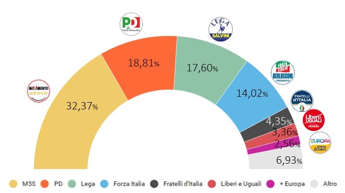 17:00 – The (almost) final results of the 2018 Italian general elections: the 5-Star Movement (Movimento 5 Stelle) has gained the position as the most largely supported party with over 30 per cent of votes thanks to an incredible result in the South of the country where in certain areas it received up to 50 per cent of consensus. The League, previously Northern League(Lega, previously Lega Nord) has received consensus throughout the country reaching a total of 18 per cent of votes – compared to 4 per cent in the last general elections held five years ago – and has become the largest party in the centre-right coalition. On the other hand, disappointing results were achieved even in their strongholds by Forza Italia, which lost to its ally, the League, in Northern regions, and the Democratic Party (Partito Democratico) that wasn’t able to maintain its hold even on the “red” regions of the centre of the country.