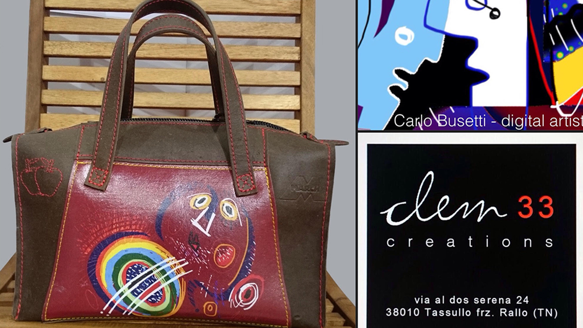 Borsa in pellemela con loghi degli studi creativi che hanno realizzato le grafiche