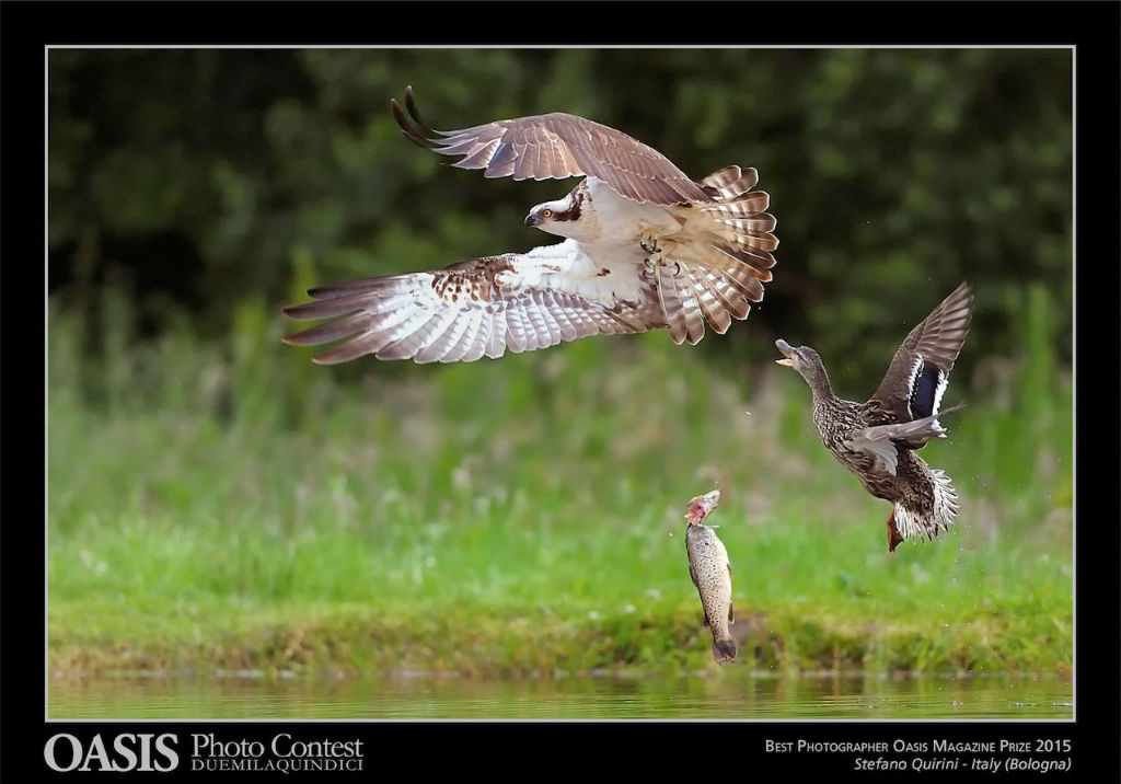 Spanish Felipe Foncueva was awarded the first prize for his shot of a marine bird capturing a fish underwater. Pierluigi Rizzato is the Best Italian Oasis Photographer 2015 with his shot of a female lion hunting a gazelle, while another Italian, Stefano Quirini, was awarded the Best Photographer Oasis Magazine Prize, with the unusual image of a duck attacking an osprey.