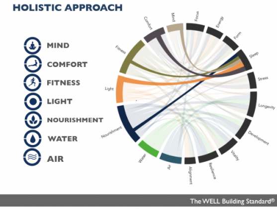 The WELL Building Standard is an evidence-based system for measuring, certifying and monitoring the performance of building features that impact health and well-being. It was initially launched to improve the way people live by developing spaces that enhance workers health and quality of life. The Standard sets performance requirements in seven concepts relevant to occupant health in the built environment – air, water, nourishment, light, fitness, comfort and mind. All these concepts are based on medical research concerning how environments affect human health.