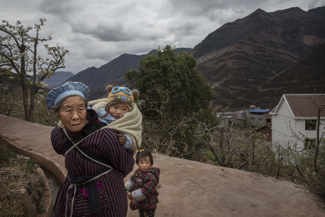 A grandmother with her grandchildren in Sichuan province, China. The area relies on pear production but the decline of pollinators such as bees because of factors including climate change is threatening livelihoods © Kevin Frayer/Getty Images