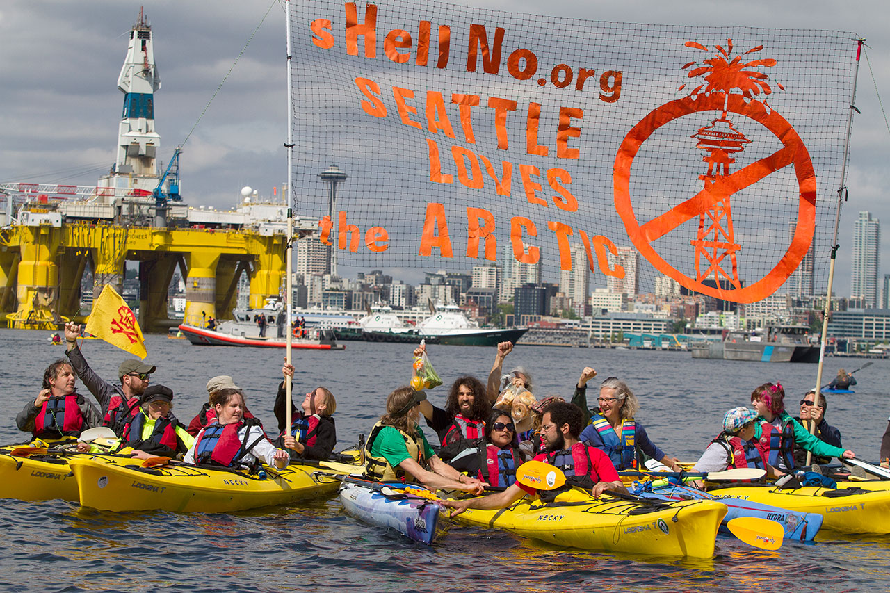 Hundreds of environmental activists filled the Elliott Bay, Seattle, United States, on board of kayaks, protesting against the decision of the Dutch oil company, Royal Dutch Shell, of exploring for oil off Alaska during summer. Kayakers formed a chain blockading the port of Seattle’s Terminal 5 in order to impede the Polar Pioneer