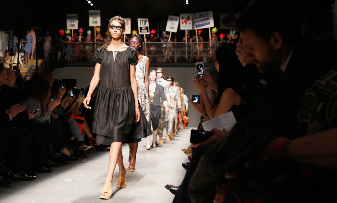 The protest against the politicians who don’t care about climate change continued even during the presentation of her collection, Vivienne Westwood Red Label SS16, at London fashion week. The stylist transformed the runaway into a demonstration where protesters modelled with their face covered in oil against the harms of hydraulic fracturing to humankind and the environment.
