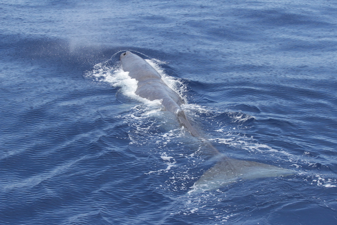 The sighting breaks the stillness and the boat immediately explodes in a frenzy of activity. Everyone has their role: taking a picture of the whale’s fluke, its tail, to establish his identity, logging his breathing pattern, taking notes on behaviour, recording vocalisations. The large whale is mostly still in the water while these data are collected non-invasively. At each powerful blow everyone onboard is in awe. After fifteen minutes or so, he gives a couple of fluke strokes, arches his back, lifts his fluke out of the water (a brief chance to discover his identity), and off he goes, back to feeding in the deep sea.